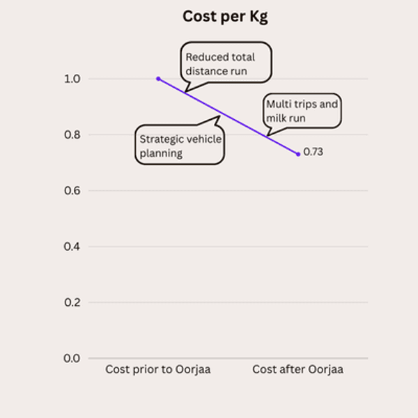 The cost graph illustrates the substantial reduction in logistics expenses in cost per kg achieved through OORJAA’s cross-docking model.